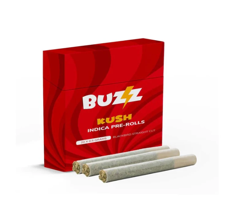 Big value, smooth experience. Buzz Kush Indica Pre-Rolls bring you 20 straight-cut, craft-quality pre-rolls at an unbeatable price. Made from whole flower-not trim or shake-, each pre-roll is crafted with 11% moisture content for optimal freshness and a clean, even burn. With a THC range of 20-25%, this indica-dominant strain delivers a rich, classic Kush flavor profile, with earthy, herbal, and gas notes that highlight its time-tested genetics. Packaged in a custom cardboard pouch and sealed in a mylar bag, these pre-rolls are easy to store, easy to share, and easy on the wallet. More rolls. More value. More Buzz.