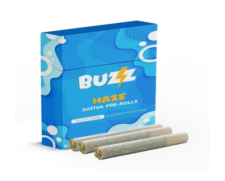 More pre-rolls, more value. Buzz Haze Sativa Pre-Rolls deliver 20 straight-cut, craft-produced joints packed with premium whole flower-not trim or shake. With a THC range of 20-25%, this sativa-dominant strain brings a bold Haze profile with citrus, spice, and pine notes that showcase its classic genetics.Each pre-roll is carefully crafted with 11% moisture content to ensure optimal freshness, a consistent burn, and a smooth draw every time. Packaged in a custom cardboard pouch and sealed in a mylar bag, these pre-rolls are easy to grab, easy to share, and easy on your wallet. More Buzz, less cost—premium pre-rolls made for everyday enjoyment.