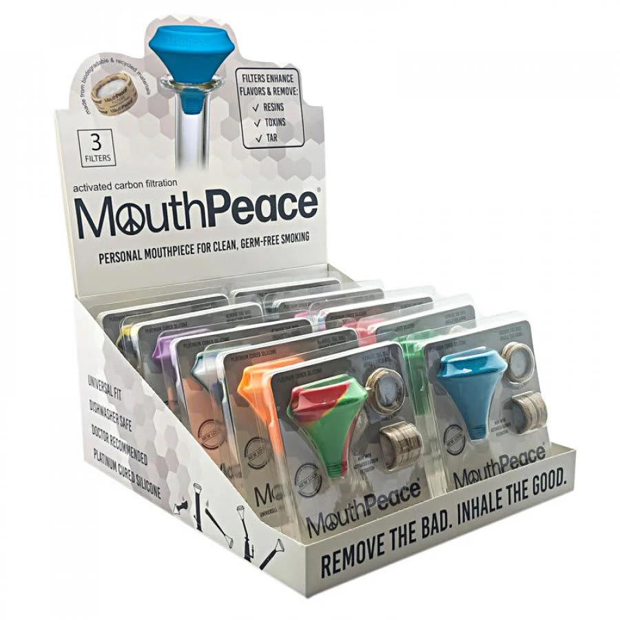 Personal Mouthpiece for Bongs & Pipes The MouthPeace is a filter and personal mouthpiece designed for use with pipes, you can even stick a pre roll in if it's fat enough. The Moose MouthPeace filter has a carbon filter disc on the inside that is replaceable. The carbon filter helps reduce harshness and filters out resin and toxins without reducing air intake. Besides filtering out the bad stuff, the MouthPeace also covers the top of pipes so you can use it instead of the germ covered surface that your friend just put their lips on. MouthPeace Features: Starter kit includes 3 filters Tapered silicone body is easy to fit into most pipes Covers normal pipe mouthpiece for personal use Discourages the spread of germs Assorted Display of 10 Made by Moose Labs What's in the Box: 10x - MouthPeace - Full Kit