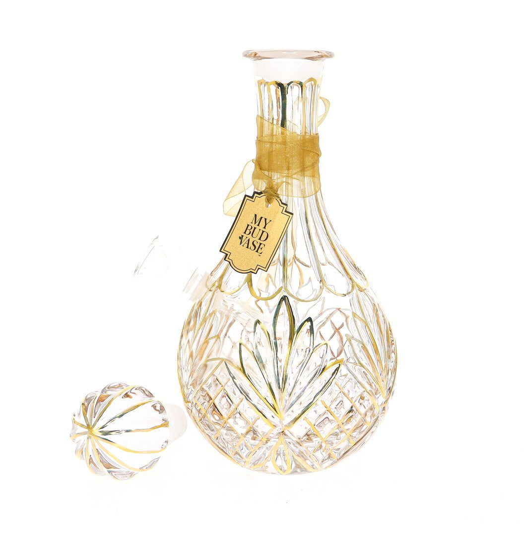 She is Stardust, she is golden and she has got to get back to the garden, (or perhaps she's got to get to the centre of your entertaining table) because this lovely lady will leave a lasting impression. This thick textured glass decanter features hand-painted gold detailing with a matching stopper. She comes with a large clear bubble bowl and an ivory pearl anemone flower poker. This piece is everything you're looking for in a decorative and functional My Bud Vase is sure to add a sparkle to all your festivities!!