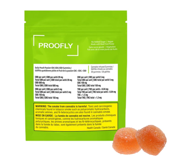 Start your day with a burst of flavour with our Daily Peach Passion Gummies. Each gummy is expertly crafted with a harmonious blend of 5mg CBC, 5mg CBG, 20mg CBD, and green tea that delivers a refreshing peach passionfruit flavor that elevates your daily routine. Our Daily gummies are made without animal products, gluten, with no added sugar and are ideal for those who prefer a delicious and convenient format for their daily wellness regimen. Make every day count with the power of nature's finest ingredients by your side. Ingredients: Fructooligosaccharides, Water, Erythritol, Natural flavour, Pectin, Citric acid, Sodium citrate, Real fruit puree, Natural colour (Vegetable juice, Turmeric), Cannabis extract, Hemp seed oil, Sunflower lecithin, Terpenes
